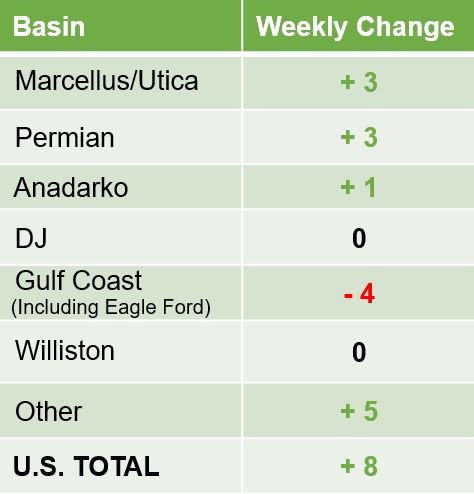 The count is up 7% on the month and up 104% on the year. Major plays with the largest week-over-week increases were in Appalachia and the Permian, each gaining three rigs for respective totals of 44 and 230.
