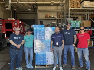 (As part of OG&E’s fan distribution program, John Koons, OG&E Community Outreach Coordinator; Allison Terrill, OG&E Community Outreach Coordinator; Paul Durrett, Salvation Army Social Services Manager; Kyle Sexton, OG&E Heavy Hauling Coordinator; and Victor Teran, OG&E Heavy Hauler pass out fans at the Salvation Army of Central Oklahoma to help keep local residents safe and …