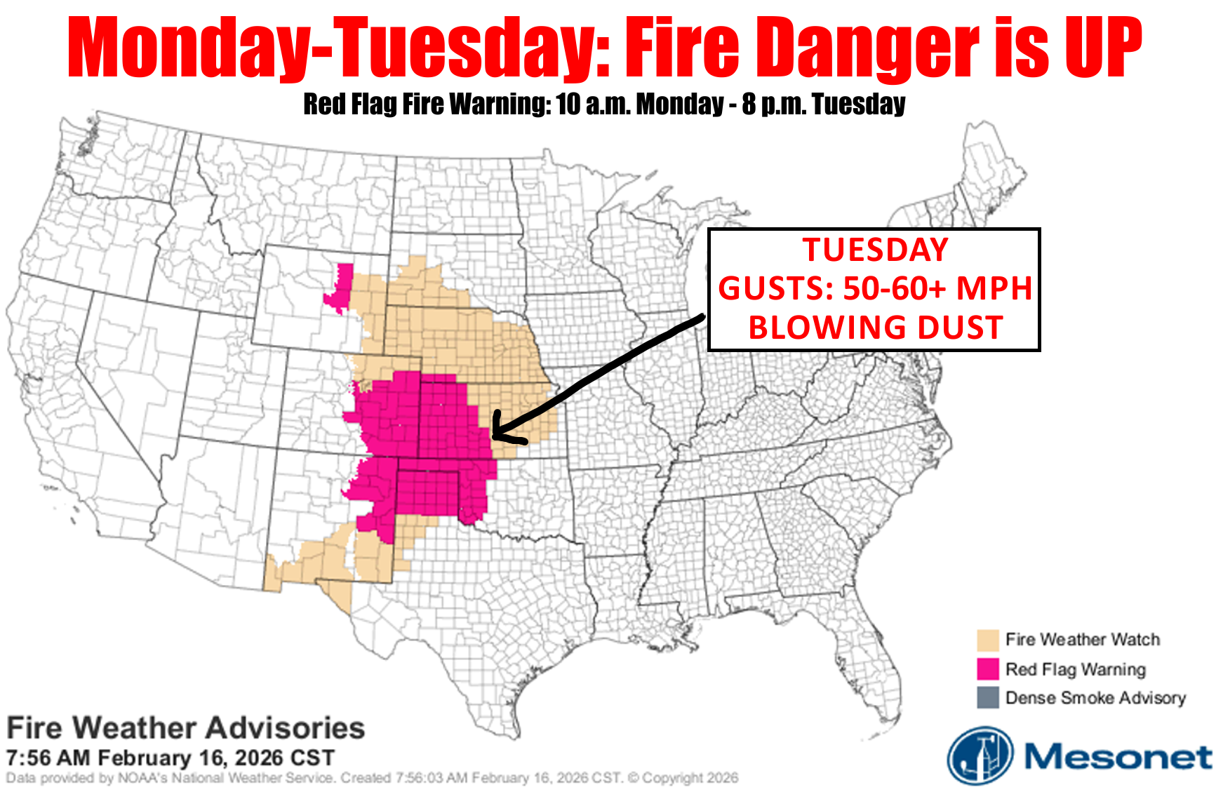 generally along and north of I-44. High to very-high fire danger